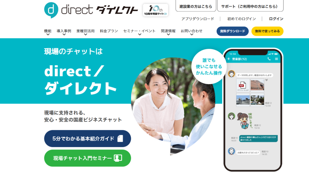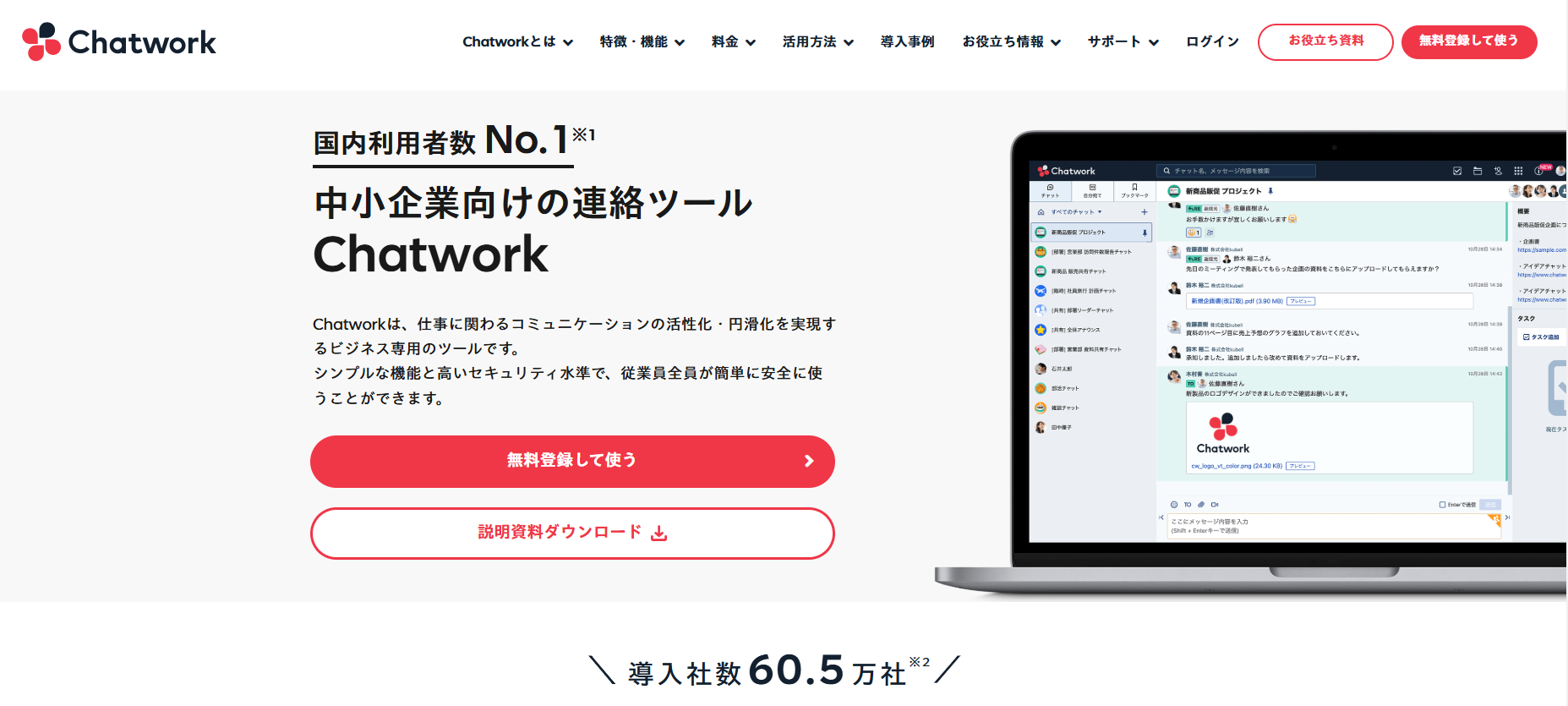 Chatworkは、国内利用者数No.1を誇る純国産のビジネスチャットツールで、特に中小企業向けに最適化された連絡ツールです。専門的なITスキルがなくても簡単に使える直感的なインターフェースが特徴で、ビジネスコミュニケーションの活性化に貢献します。