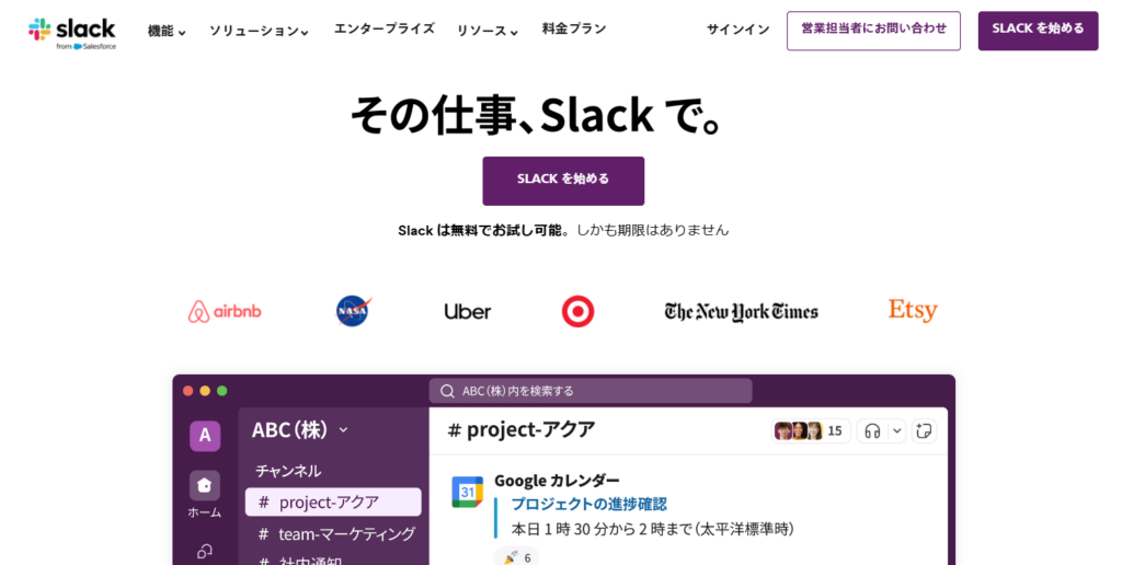 プロジェクトやチームごとに「チャンネル」という会話スペースを作成することで、情報が整理され、必要な情報に素早くアクセスできます。また、社外のパートナーや顧客とも安全に連携できる「Slackコネクト」機能も多くの企業で活用されています。